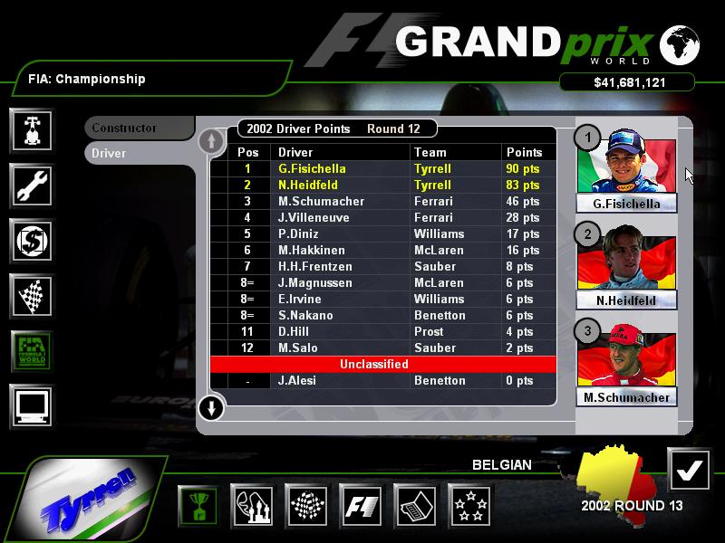 OK, Nick is within a race W + Fisi Non-points of taking the lead of the WDC. This is heating up now. Also, MSC is well out of reach of the WDC, so the 2002 champion will be a Tyrell driver.